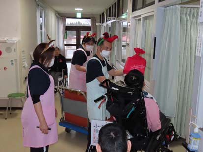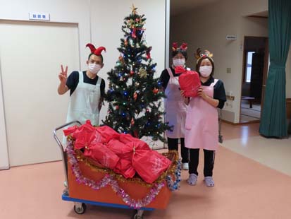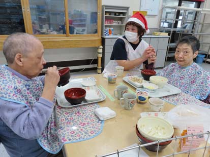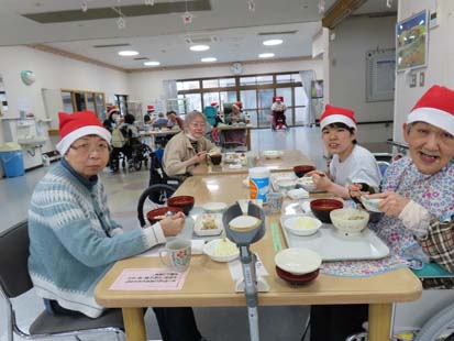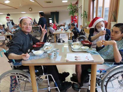 令和7年12月24日(水)に、クリスマス会を開催しました。 昼食時にクリスマスの特別メニューがふるまわれたほか、利用者自治会よりケーキの提供がありました。 昼食後には施設から利用者のみなさんへプレゼントが贈られ、喜びの声がきかれました。 |